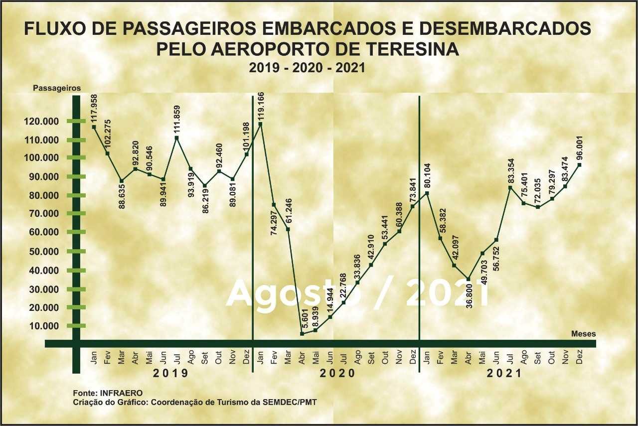 O número de passageiros transportados por meio do Aeroporto Petrônio Portela, em Teresina, voltou a crescer em 2021 após a queda de mais de 50% em 2020, quando a pandemia afetou o mercado aéreo em todo o mundo. 818 mil pessoas embarcaram e desembarcaram no ano passado na capital pelo terminal, uma alta de 43% em relação ao ano anterior, que registrou apenas 571 mil passageiros. Os dados são da Infraero.